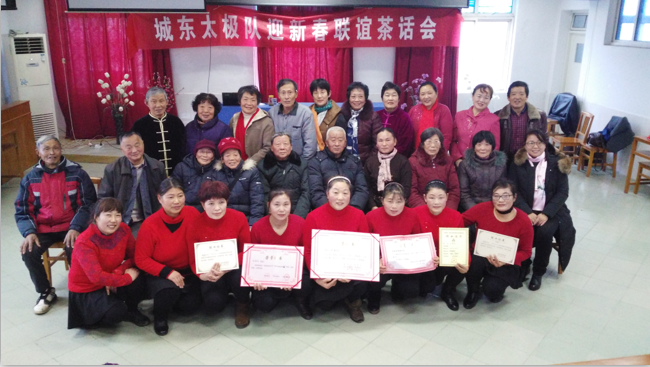聯(lián)誼會上,太極隊隊長胡建軍發(fā)言說:“城東太極隊在過去的一年里,多次參加射陽縣舉辦的各項中老年人的活動,并屢次獲獎。希望大家在新的一年里,繼續(xù)發(fā)揚(yáng)團(tuán)結(jié)友愛的精神,齊健身、同歡樂。”