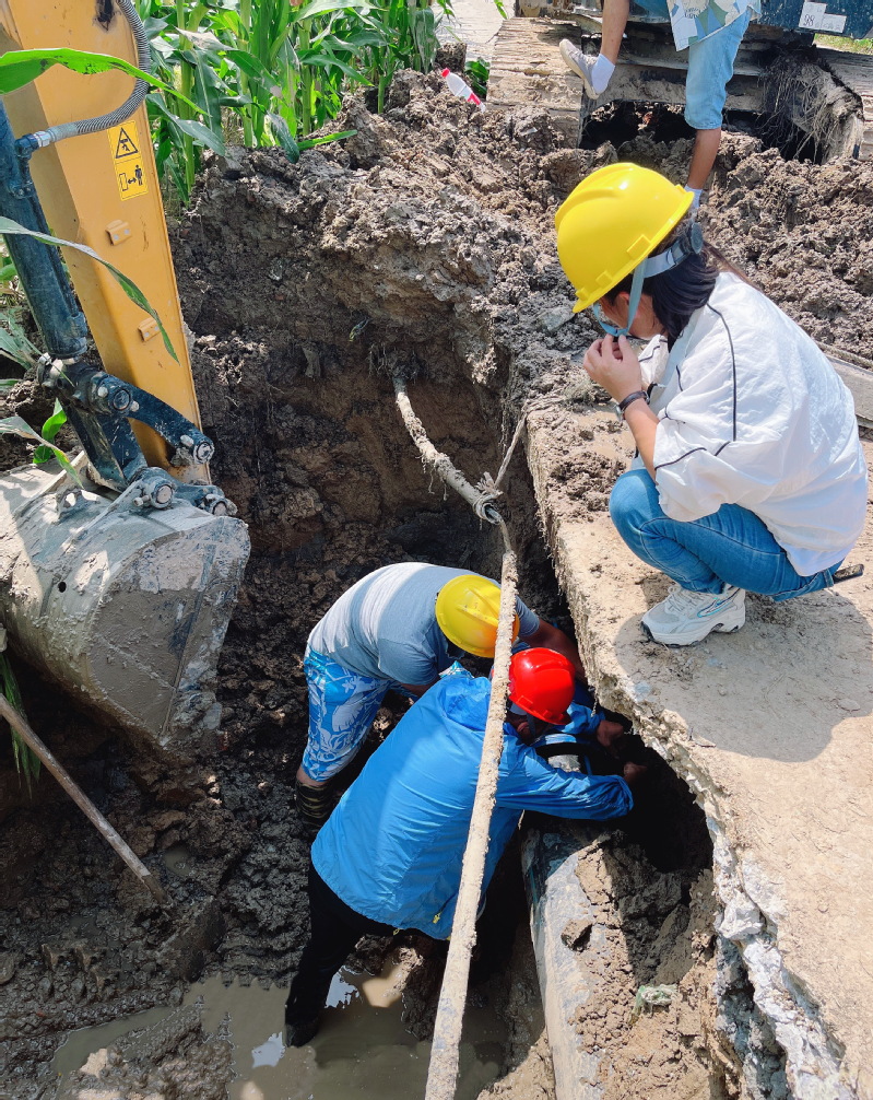 隨著調(diào)來(lái)的挖掘機(jī)清理掉外圍的泥土后,公司員工小心翼翼地沿著滲水的方向掏掉主管道外側(cè)的泥土。原來(lái)是當(dāng)時(shí)鋪設(shè)管道施工時(shí),在管道下方泥土中埋有一塊尖銳角的石頭,隨著時(shí)間的推移和公路車(chē)輛的長(zhǎng)期輾壓,主管道下沉后被石塊擠破了壁管而造成滲漏。