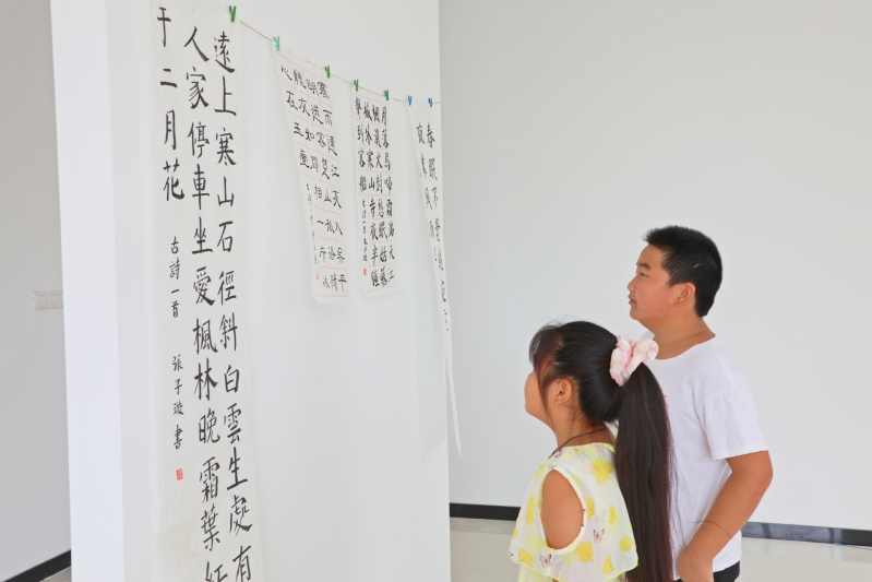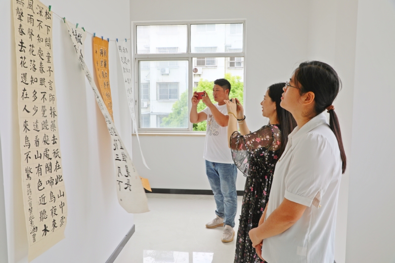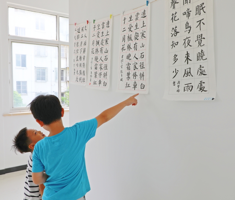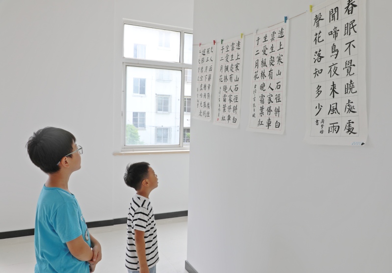 8月28日,在江心沙職工書屋二樓,一場(chǎng)為期一周,象征著收獲的青少年書法展,吸引了不少職工居民和學(xué)生前來(lái)觀覽。圖為“書迷”們觀摩“暑期公益課堂·書法班”“結(jié)業(yè)”作品的溫馨場(chǎng)景。