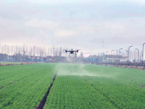江蘇農(nóng)墾淮海農(nóng)場使用植保無人機(jī)對大小麥田莖葉處理化除,防除田間雜草。