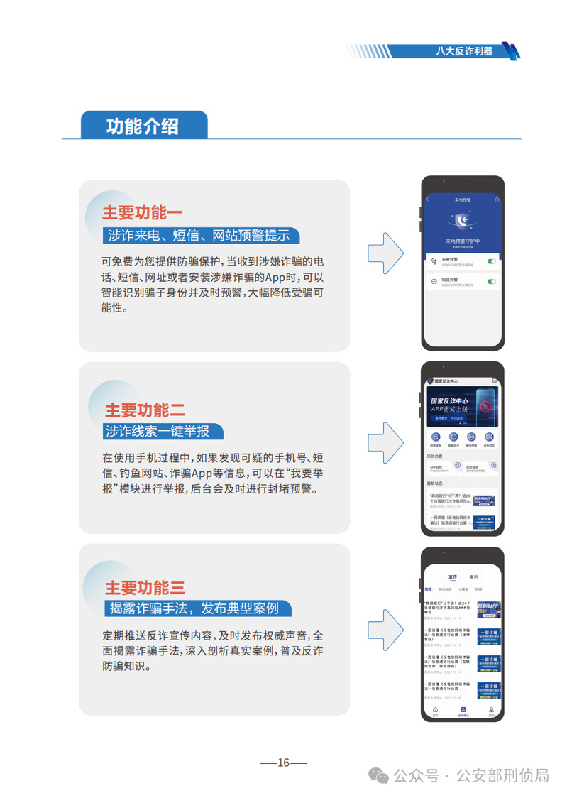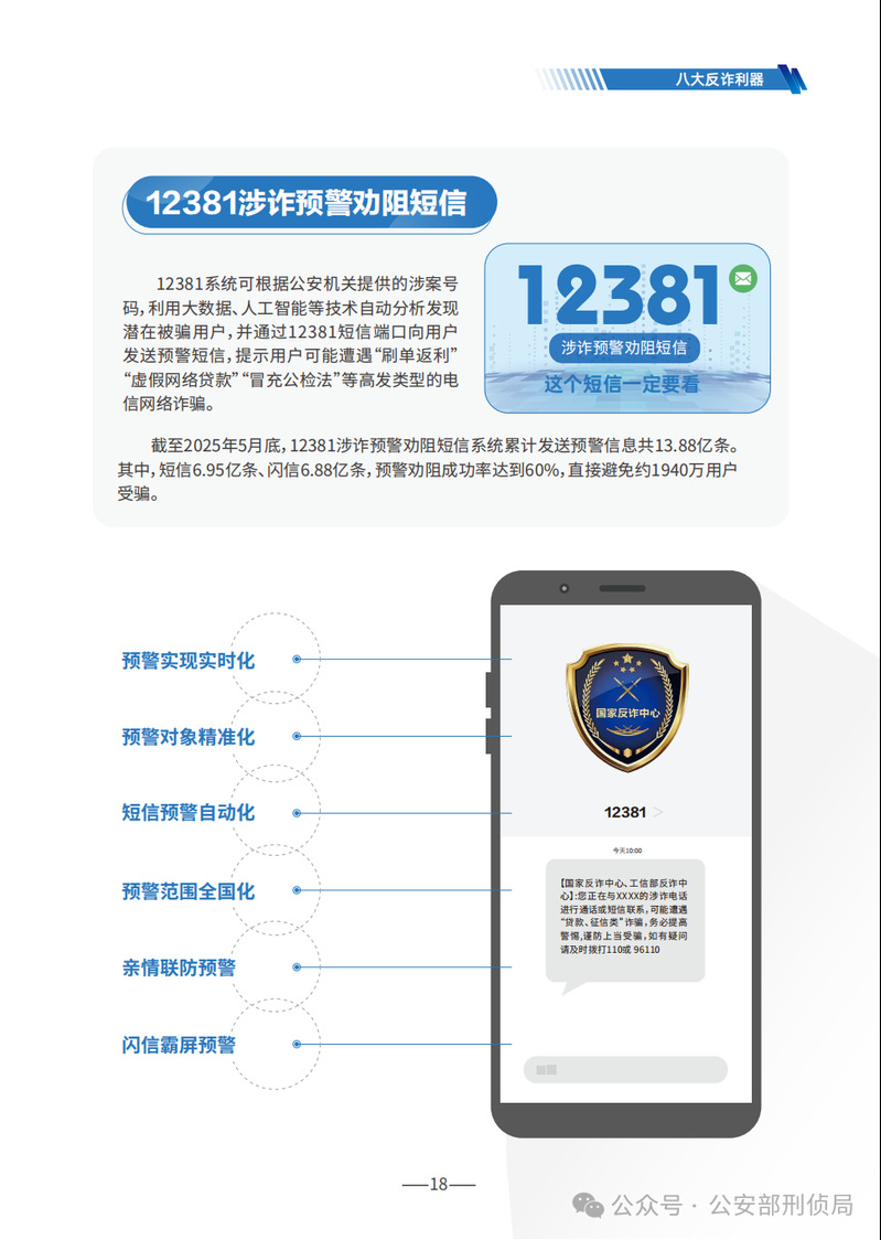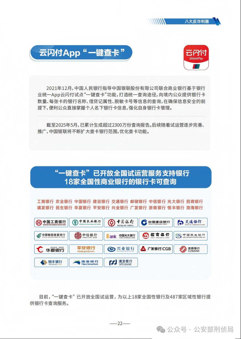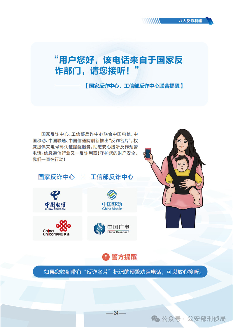 《手冊》詳細(xì)梳理了刷單返利、虛假網(wǎng)絡(luò)投資理財(cái)、虛假購物服務(wù)、冒充電商物流客服、貸款征信、冒充領(lǐng)導(dǎo)熟人、冒充公檢法、婚戀交友、網(wǎng)絡(luò)游戲產(chǎn)品虛假交易、機(jī)票退改簽等10類高發(fā)的電信網(wǎng)絡(luò)詐騙類型,通過典型案例剖析,逐個(gè)解析詐騙套路,揭批作案手法,為易受騙群體“量身定制”反詐防騙提示。同時(shí),《手冊》詳細(xì)介紹了前期公安部會(huì)同工信部、中國人民銀行推出的七大反詐利器——國家反詐中心APP、96110預(yù)警勸阻專線、12381涉詐預(yù)警勸阻短信系統(tǒng)、全國移動(dòng)電話卡“一證通查”、全國互聯(lián)網(wǎng)賬號(hào)“一證通查”、反詐名片、云閃付APP“一鍵查卡”,以及今年工信部推出的第八個(gè)反詐利器——跨境提醒服務(wù),幫助群眾有效甄別境外來電。此外,《手冊》首次總結(jié)提煉了幫助群眾快速破譯騙局的20個(gè)防詐關(guān)鍵詞,切實(shí)構(gòu)筑攔截電信網(wǎng)絡(luò)詐騙的“防火墻”。