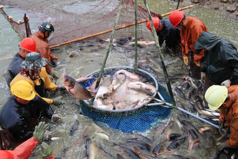 9月15日,江蘇省連云港市海州區(qū)的江蘇農(nóng)墾崗埠農(nóng)場,水產(chǎn)工人們在魚塘里拉網(wǎng)捕撈分揀花鰱、白鰱等水產(chǎn)品,準備發(fā)往周邊市場銷售。