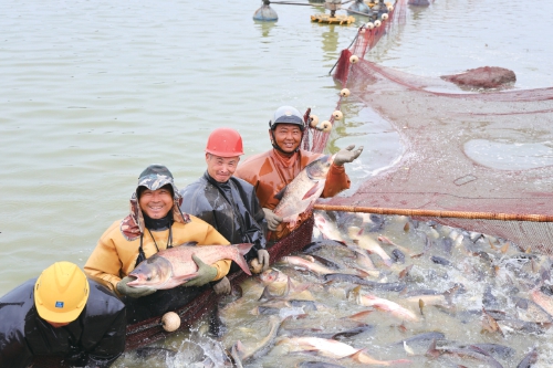 近日,江蘇省連云港市海州區(qū)的江蘇農(nóng)墾崗埠農(nóng)場(chǎng),工人們?cè)隰~塘里拉網(wǎng)捕撈分揀花鰱、白鰱等水產(chǎn)品,準(zhǔn)備發(fā)往周邊市場(chǎng)銷售?!?br />