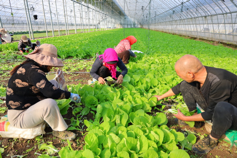 10月23日,江蘇省連云港市海州區(qū)的江蘇農(nóng)墾崗埠農(nóng)場(chǎng),訂單蔬菜喜獲豐收。菜農(nóng)們?cè)诖笈锢锊墒照硇迈r的蔬菜,并進(jìn)行打包稱重,田間地頭一片繁忙景象。近年來(lái),當(dāng)?shù)卮罅Πl(fā)展規(guī)?;笈锸卟朔N植,采取“市場(chǎng)+訂單+農(nóng)戶”的方式,促進(jìn)菜農(nóng)增收。