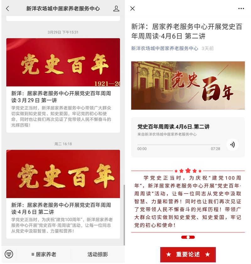 據(jù)悉,中心始終以“以老服務(wù)”為宗旨,從老年人的日常生活和精神需求出發(fā),全力解決老年人的緊急救援、日常照料、精神慰藉等諸多服務(wù)。為提高老年人的精神需求,該中心堅持“學(xué)黨史正當時”,共設(shè)立重要論述、黨史回眸、歷史瞬間三個部分,通過周周讀活動,讓來中心活動的老黨員通過朗讀方式回顧黨的歷史,并通過線上推廣讓關(guān)注居家養(yǎng)老服務(wù)中心發(fā)展的職工群眾都能做到知史愛黨、知史愛國,尤其是提醒廣大黨員思踐悟,想一想,比一比,那些革命先烈為了民族解放、國家富強、人民幸福,英勇斗爭、不怕犧牲的堅強意志和革命精神,今天我們幸福生活的來之不易;同時結(jié)合自身,想一想,為民情懷是否扎實,比一比,為民服務(wù)本領(lǐng)是否過硬……通過學(xué)習(xí)增強黨員責(zé)任擔(dān)當,用心用情用勁為人民群眾解決煩心事。