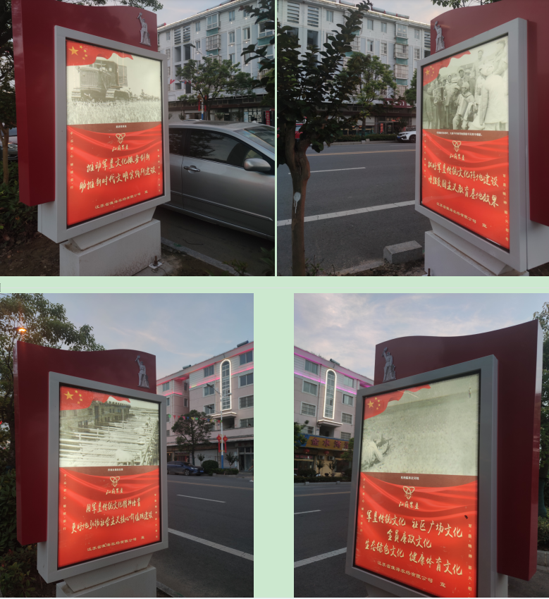 這些燈箱中,廣告燈箱的一面看到統(tǒng)一印制的建黨百年歷史的畫面外,在燈箱的另一面,除了印制江蘇農(nóng)墾統(tǒng)一的LG標(biāo)識和“不忘初心 繼續(xù)前行”“軍墾精神 薪火相傳”的細(xì)小字體外,還分別印有農(nóng)建四師將士在農(nóng)場“三大戰(zhàn)役”進(jìn)程中開墾建設(shè)的不同老照片附說明,印有不同風(fēng)格的軍墾傳統(tǒng)文化標(biāo)語,并在畫面外的框架上,安裝了鑲嵌在其上的軍墾傳統(tǒng)文化的標(biāo)志,濃郁的軍墾傳統(tǒng)文化在廣告燈箱中的完美組合,讓仍健在的老軍墾們甚是激動,說農(nóng)場黨委以這種方式宣傳弘揚軍墾傳統(tǒng)文化,這是對他們建設(shè)農(nóng)場最好的肯定。