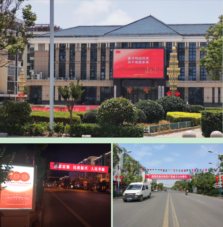 利用《淮海大地》報刊登淮海黨史學習教育重大活動和特色情況,并在報紙上開辟“黨史學習教育在淮?!薄啊畬W史力行 爭當先鋒’征文”專欄,讓農(nóng)場開展的黨史學習教育任務通過傳統(tǒng)媒體的分發(fā),讓大家知曉農(nóng)場公司黨史學習教育情況;利用櫥窗開設專欄,目前已連續(xù)兩期刊登了農(nóng)場黨史學習教育專欄,通過圖文并茂的形式,將農(nóng)場新近開展黨史學習教育的做法直觀地展現(xiàn)出來,讓大家知其然,更知其所以然,從而在農(nóng)場深化黨史學習教育的成果;通過現(xiàn)代媒介的微信公眾號進行黨史學習教育的傳播,到目前為止,已經(jīng)發(fā)布有關黨史學習教育的各類會議、做法、經(jīng)驗及參與互動等44篇文章,將黨史學習借助現(xiàn)代互聯(lián)網(wǎng)進行傳播,提升淮海黨史學習教育在農(nóng)場內(nèi)外的效果和影響力;在農(nóng)場公司廣大黨員和青年員工中開展黨史知識題目有獎專項征集活動,并從6月1日起連續(xù)開展26個星期為平臺的黨史知識有獎競賽活動周,有效地提升農(nóng)場公司黨員干部和管理人員的積極性,促進了大家實施以考促學,以學促干活動的熱潮;農(nóng)場文化廣場是淮海人每晚休閑娛樂的場所,農(nóng)場通過在廣場前的LED大屏上播放黨史學習教育相關的紅色電影、微紀錄片、標語、習總書記七一講話及新聞聯(lián)播等內(nèi)容;在文化廣場東側(cè)樓體上書寫“人民有信仰 國家有力量 民族有希望”廣告牌,利用淮海路跨路廣告宣傳牌,書寫“熱烈慶祝中國共產(chǎn)黨成立100周年!”“國家富強 民族興旺 人民幸?!卑鬃旨t底燈光標語,利用淮海路兩側(cè)燈光廣告宣傳牌的效應,弘揚軍墾傳統(tǒng)文化,從而達到弘揚主旋律,振奮人心的作用;利用農(nóng)場企業(yè)微信平臺,組建網(wǎng)上農(nóng)場黨委理論中心組(擴大)群,通過每月配發(fā)“第一議題”材料,將習近平總書記的重要講話內(nèi)容原文全文轉(zhuǎn)載;網(wǎng)上黨史學習教育課堂的開展及紅色紀錄片的推送,將每項江蘇省農(nóng)墾集團公司黨史學習教育工作簡報上傳平臺,讓大家實時了解墾區(qū)黨史學習教育活動的開展情況和發(fā)展動態(tài),從中汲取黨史學習教育中的閃光點,根據(jù)自身單位的實際來觸類旁通、為我所用,從而提升黨史學習教育的成果;利用農(nóng)建四師陳列館國家AA級紅色旅游基地的優(yōu)勢,除安排基層黨組織和黨員干部入館接受黨史學習和軍墾傳統(tǒng)文化教育外,自黨史學習教育開展以來,已為墾區(qū)內(nèi)外3000多人次黨員干部和職工群眾提供講解服務。圖為淮海部分黨史學習教育宣傳標語。