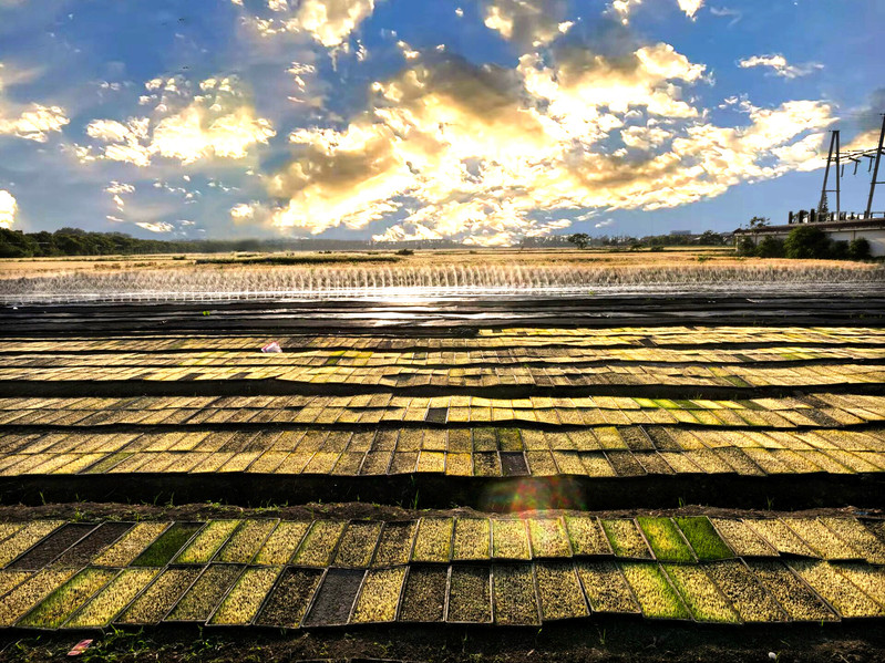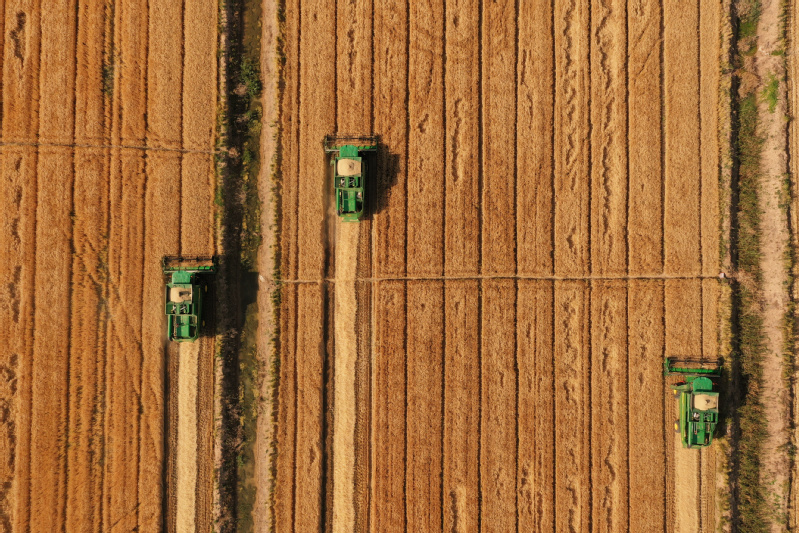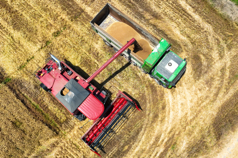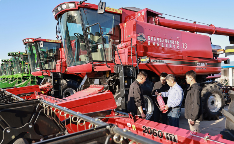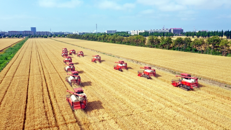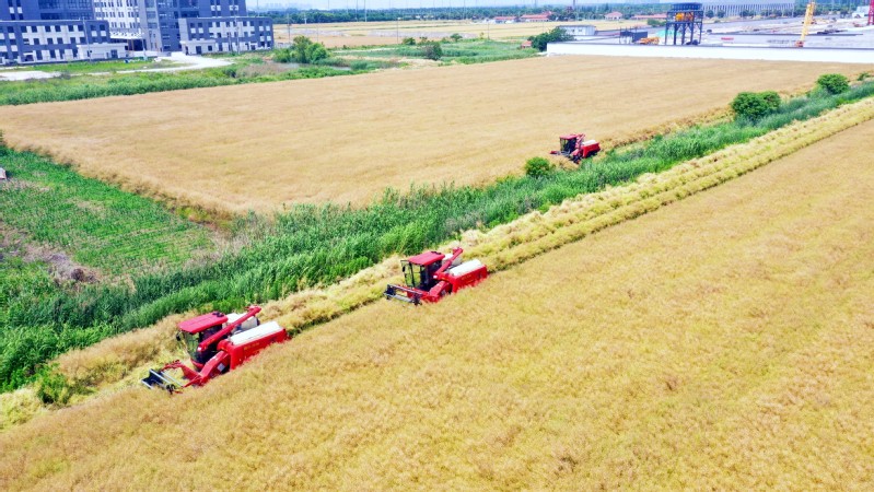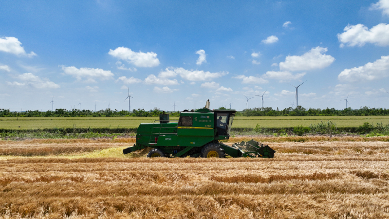 風(fēng)吹麥田千重浪,麥粒漸滿穗金黃。5月22日中午,4臺(tái)約翰迪爾C2400大型聯(lián)合收割機(jī)開進(jìn)了蘇墾農(nóng)發(fā)濱淮分公司27大隊(duì)大麥田間,迎來了今年夏收“第一鐮”。伴隨著收割機(jī)陣陣轟鳴聲,一排排大麥被卷入收割機(jī)中,稻穗經(jīng)過脫粒、碎桿等工序后收入機(jī)艙,輸送到運(yùn)糧車上,并拖向場(chǎng)頭翻曬。半天時(shí)間,近300畝大麥?zhǔn)崭罱Y(jié)束。收割現(xiàn)場(chǎng),農(nóng)水中心和大隊(duì)管理人員在田間檢查收割質(zhì)量?!斑@是我們今年‘三夏’的首次收割,我們前期對(duì)24臺(tái)收割機(jī)進(jìn)行檢修、調(diào)試、保養(yǎng),確保農(nóng)機(jī)以最佳狀態(tài)投入到夏收工作中,務(wù)必要把收割損失率降到最低?!鞭r(nóng)水中心副主任孟琪表示。“今年六生產(chǎn)區(qū)大麥單產(chǎn)有望超去年,按照‘三夏’動(dòng)員會(huì)部署,堅(jiān)持質(zhì)量和標(biāo)準(zhǔn)化,搶抓晴好天氣開展收割作業(yè),計(jì)劃在28日前完成六生產(chǎn)區(qū)的大麥?zhǔn)崭罟ぷ鳎浞掷煤冒汛篼湹牟缈趦?yōu)勢(shì),奠定秋糧豐產(chǎn)基礎(chǔ)。”六生產(chǎn)區(qū)主任盧剛說。