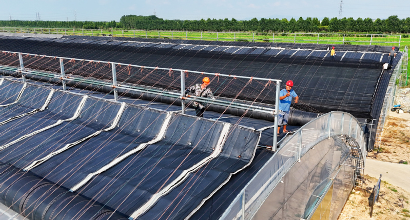 7月29日,連云港市海州區(qū)崗埠農(nóng)場,工作人員正在檢查、加固蔬菜大棚,防范臺風“竹節(jié)草”。