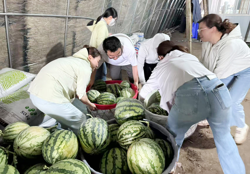 “產(chǎn)業(yè)中心急需支援!”6月12日下午3點,東壩頭農(nóng)場工作群消息剛彈出,20多名農(nóng)場機關(guān)青年已沖向西瓜地。烏云壓頂,一場與暴雨的賽跑就此展開。在6大隊15號田地里,青綠的西瓜藤蔓間閃動著忙碌的身影。男同志們喊著號子將沉甸甸的瓜筐抬上三輪車,女同志們抱著10多斤的西瓜接力傳遞。“輕點放!”“這邊再來一筐!”產(chǎn)業(yè)發(fā)展中心龔玲玲的提醒混著此起彼伏的應(yīng)答聲。此時的天空已開始飄落淅淅瀝瀝的雨絲,泥水濺上褲腿,汗珠滾落臉頰,54筐西瓜在40分鐘內(nèi)全部安全入倉?!霸蹅冞@速度,能拍動作片了!”負(fù)責(zé)裝車的王瑋琦抹著汗笑道。豆粒大的雨點終于砸了下來,這群年輕人相視而笑,沾滿泥點的鞋子在田埂上留下一串深深淺淺的印記。