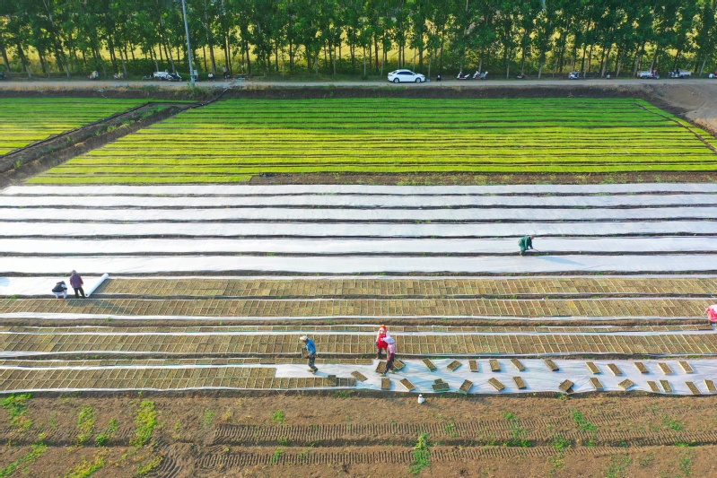 在蘇墾農(nóng)發(fā)崗埠分公司田頭,職工們正在把經(jīng)“暗化”后的秧盤移到大田里,采用微噴灌技術進行集中育秧,加強精準水肥調控、集中標準化育秧管理,為即將開展的機插秧作業(yè)夯實基礎。