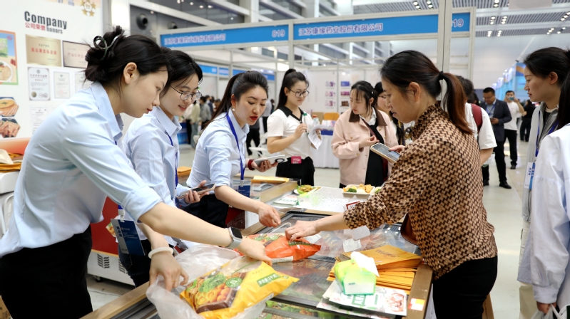日前,“蘇新消費?夏夜生活”暨第六屆連云港網(wǎng)絡購物季盛大開幕。東辛農(nóng)場的“簡蘇”牛奶與“東米”雞產(chǎn)品攜手亮相,組成“健康CP”,在展會上大放異彩,引發(fā)消費熱潮。圖為顧客在“東米”展位前采購雞產(chǎn)品。